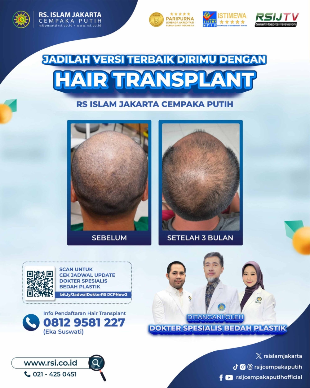 Jadikan tampilanmu lebih permanen dengan layanan hair transplant persembahan RS Islam Jakarta Cempaka Putih. Ditangani langsung oleh dokter spesialis bedah plastik, Anda akan mendapatkan layanan paripurna dan permanen yang dapat meningkatkan kepercayaan dirimu.