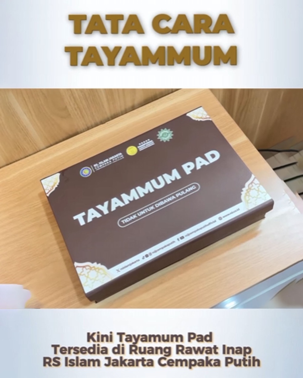 Sebagai implementasi standar islami rumah sakit Muhammadiyah 'Aisyiyah, RS Islam Jakarta Cempaka Putih hadirkan fasilitas tayammum pad di ruang rawat inap untuk memudahkan kamu yang sedang sakit untuk beribadah. Salah satunya di Paviliun Muzdalifah kelas VVIP dan VIP.