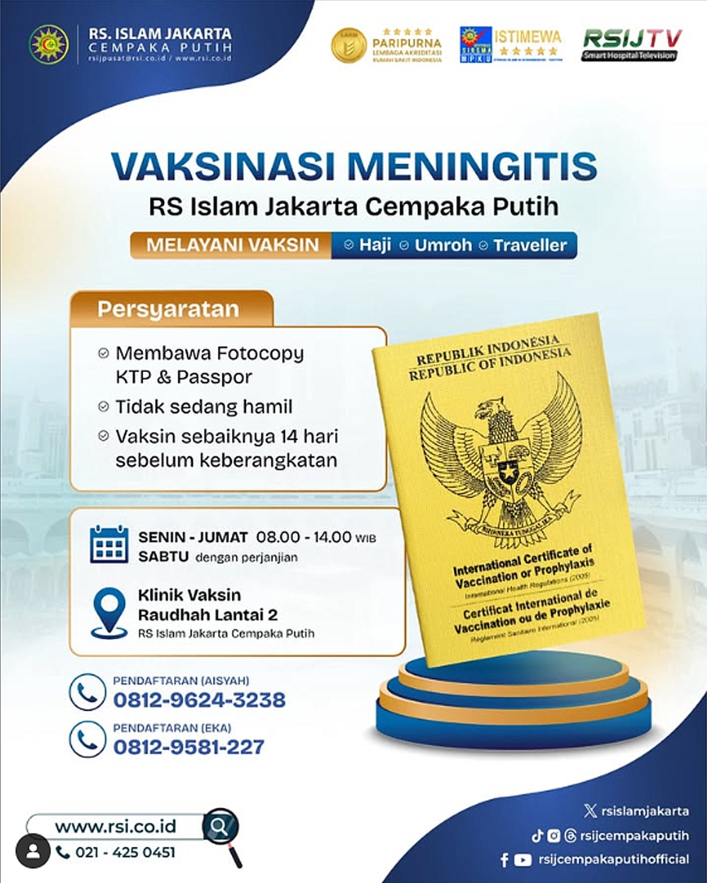 Yeaayy sekarang vaksin meningitis plus buku kuningnya sudah tersedia di RS Islam Jakarta Cempaka Putih. Buruan daftar segera, karena persediaan terbatas!