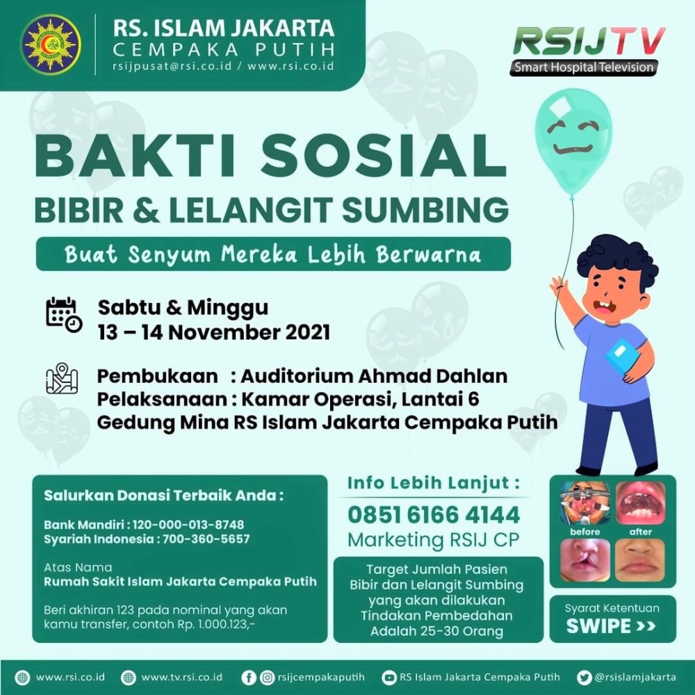 Sebagai amal usaha Persyarikatan Muhammadiyah di bidang kesehatan, RS Islam Jakarta Cempaka Putih menggelar bakti sosial bibir dan lelangit sumbing yang akan digelar pada hari Sabtu dan Minggu, 13 dan 14 November 2021.