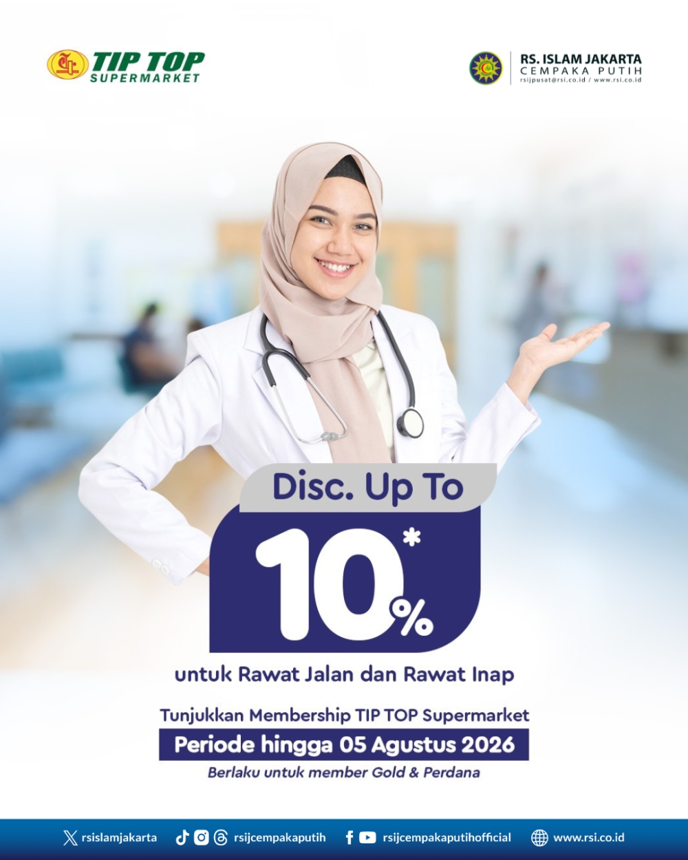 Sebagai bentuk apresiasi dan komitmen dalam memberikan pelayanan terbaik, Tip Top Supermarket bekerja sama dengan RS Islam Jakarta Cempaka Putih menghadirkan diskon 10% untuk layanan: