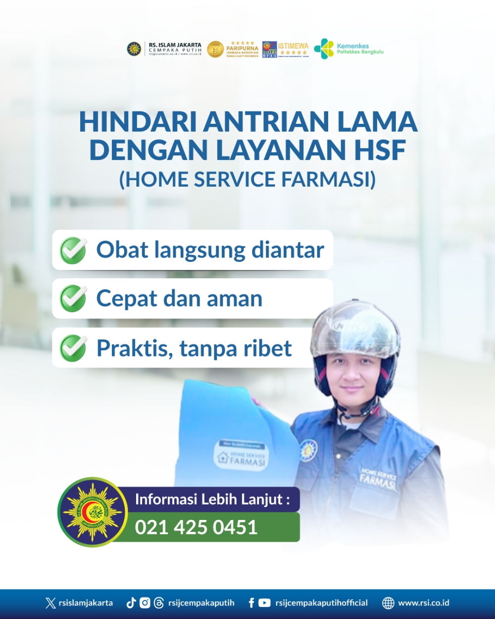 Kenalkan layanan terbaru kami Home Service Farmasi dalam mengatasi panjang dan jenuhnya menunggu antrian obat di Apotek. Layanan ini hadir sebagai salah satu bentuk komitmen RS Islam Jakarta Cempaka Putih dalam memberikan kemudahan dan layanan terbaik pada seluruh pelanggannya.