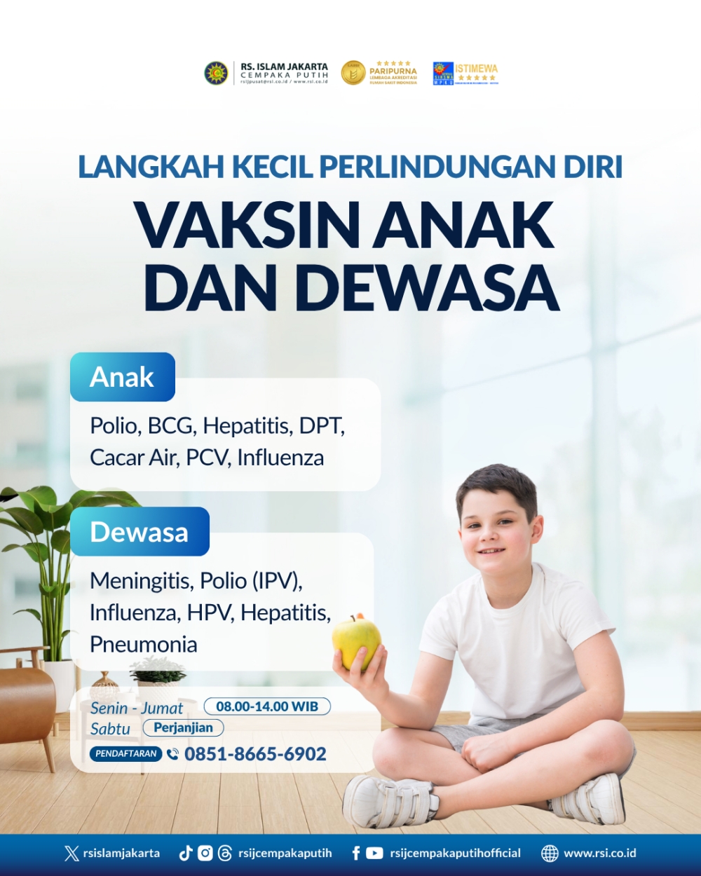 Bagi anak-anak, vaksin merupakan perlindungan awal yang berharga. Imunisasi dasar lengkap seperti BCG, Polio, DPT, Campak, hingga Hepatitis B penting diberikan sesuai jadwal agar tubuh si kecil memiliki pertahanan yang kuat terhadap infeksi. Dengan imunisasi yang lengkap dan tepat waktu, tumbuh kembang anak akan lebih optimal dan terlindungi dari risiko penyakit berat.