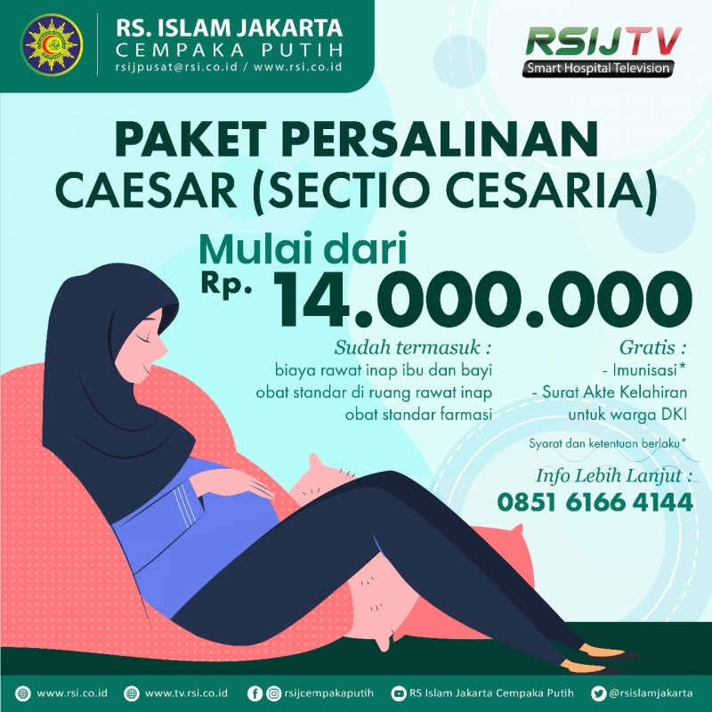 Kini persalinan dengan metode caesar (sectio cesaria) makin terjangkau di RS Islam Jakarta Cempaka Putih. Harga paket ini sudah termasuk biaya rawat inap ibu dan bayi serta obat standar di ruang rawat inap dan obat standar farmasi. Bahkan juga dapat Akta Kelahiran untuk warga DKI Jakarta dan imunisasi gratis loh.