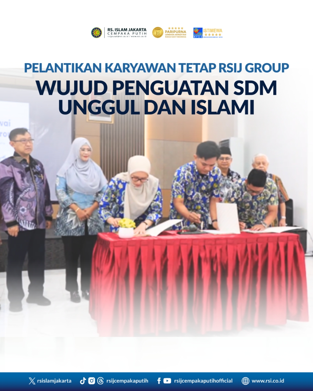 Sebanyak 128 karyawan dari RSIJ Cempaka Putih resmi dilantik menjadi karyawan tetap, bersama 53 pegawai dari RSIJ Pondok Kopi dan 40 karyawan dari RSIJ Sukapura. Acara berlangsung khidmat dengan dihadiri oleh Badan Pengelola Harian (BPH), jajaran direksi dan pimpinan RSIJ Group, serta RS Islam Jakarta Sukapura, antara lain dr. T. Mahaputeri Nusantari Maghfirah, MARS., MPM, Bpk. Teguh Pantjatmono, SE., MM.CBA., CIA, dr. Aldila Satyanugraha Al Arfah, MMR, Ns. Lilik Murdiningsih, S.Kep., MM, dan seluruh manajer dari RSIJ Group.