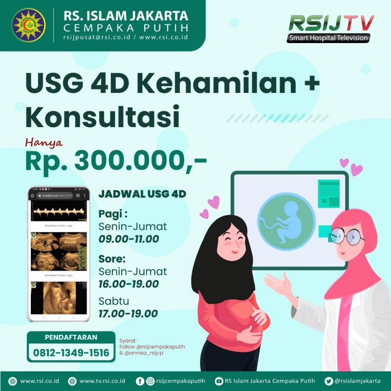 Bunda, yuk periksakan kehamilanmu dengan teknologi USG 4D dari RS Islam Jakarta Cempaka Putih dengan paket harga yang ekonomis, bahkan sudah termasuk biaya konsultasi juga loh. Bunda akan mendapatkan hasilnya secara digital melalui link yang akan diberikan setelah pemeriksaan. Untuk mendapatkan layanan ini, sahabat wajib follow akun ini dan @annisa_rsijcp yaaa...