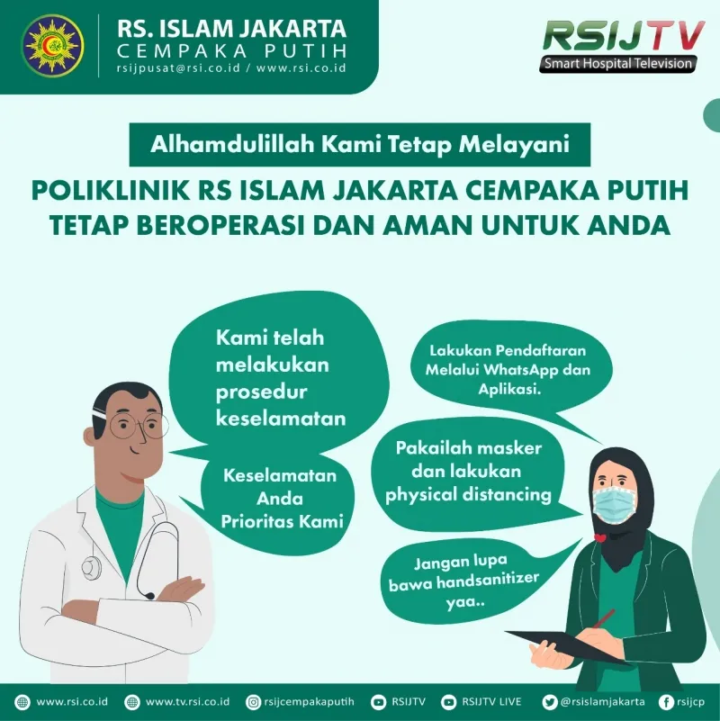 You are here:RSIJCP/Pusat Informasi/Berita & Informasi/Poliklinik dan Rawat Inap Tetap Buka dan Insya Allah Aman dengan Menerapkan Prosedur Kesehatan dan Keselamatan untuk Pasien, Keluarga dan Petugas