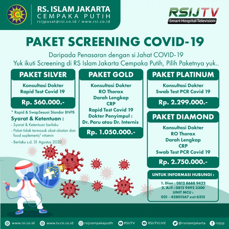 Assalamualaikum sahabat RSIJ CP dimana pun berada bagaimana kabarnya hari ini, hari ini Kami memberi kabar baik nih bahwa di RS Islam Jakarta Cempaka Putih aman untuk melakukan Screening COVID-19. Lakukan pendaftaran 1 hari sebelumnya menggunakan aplikasi atau mengunakan WhatsApp