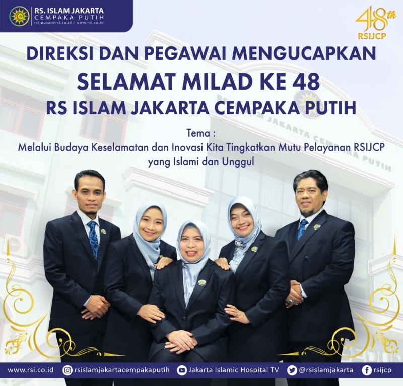 Alhamdulillah RS Islam Jakarta Cempaka Putih sudah genap berusia 48 tahun 23 Juni 1971 - 23 Juni 2019, semoga pengabdian kami untuk menyehatkan umat diberkahi Allah SWT, dan kedepannya dapat terus meningkat kan mutu pelayanan agar seluruh pelanggan puas dan selalu menjadi Rumah Sakit yang Islami dan Unggul.. aamiin..