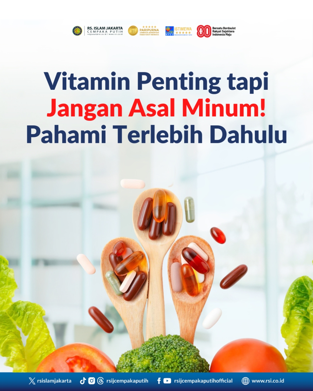 Meskipun vitamin penting untuk tubuh, namun sebaiknya vitamin diperoleh dari makanan terlebih dahulu seperti sayur, buah, kacang-kacangan dan ikan. Suplemen hanya sebagai pelengkap dan bukan pengganti nutrisi harian anda. Untuk aturan minum dan dosis yang diperlukan sebaiknya lakukan konsultasi dengan dokter terlebih dahulu. Konsultasi dan berobat di RSIJ Cempaka Putih bersama dokter pilihan anda, kini bisa dilakukan dengan lebih mudah melalui aplikasi RS Islam Cempaka Putih di Google Play, tanpa antri tanpa ribet!
